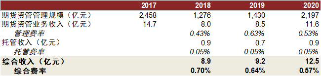期货资管收入体量较小,2020年行业收入约12.5亿元。目前期货资管规模及收入体量较小,2020年期货资管管理规模约2197亿元,我们假设2020年管理费率为2018-2019平均,测算期货资管收入规模约12.5亿元。