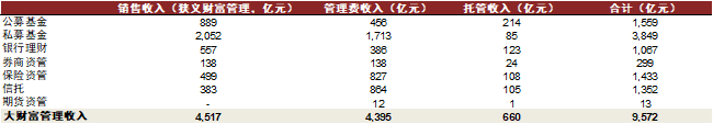 广义财富收入主要包括销售收入、管理费收入及托管收入。广义财富收入下主要包含三大项业务收入:(1)资管产品销售交易过程中产生的销售收入,即目前通常认为的财富管理收入。(2)资管机构收取的管理费收入,包括固定部分及超额业绩提成部分。(3)归属资金托管机构的托管费收入。
