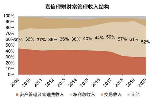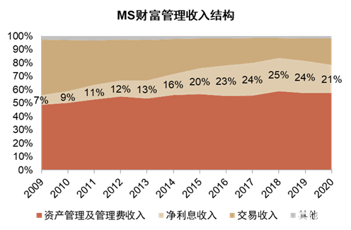 海外财富管理机构净利息收入贡献约1/4财富管理收入。从收入结构上看,摩根士丹利和瑞银净利息收入占比稳定在四分之一左右,佣金收入和资产管理收入此消彼长,并且资产管理类收入始终是收入中贡献最大的部分,最近5年摩根士丹利和瑞银的资产管理收入/净利息收入/交易类收入占比分别为57%/24%/18%、56%/25%/19%。嘉信理财2015年前收入结构与瑞银等相似,但呈现出不同趋势,净利息收入占比不断提升,其他两类收入占比萎缩,最近5年来净利息收入占比超过资产管理收入成为营收的主要来源,占比53%。
