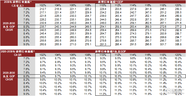 预计基准情景下2030年中国资产管理行业规模达到254万亿元,复合增速10.2%。在《中国财富管理行业展望—引入中金分析框架》中,我们对国内财富管理行业发展特征进行了分析。我们认为,当前国内财富管理行业处于规模快速增长的发展初期,向前看,考虑我国经济持续增长、直接融资占比提升、资管行业渗透率提升等因素,根据名义GDP增速及资管行业规模占GDP比重,我们测算基准情景下2030年中国资产管理行业规模为254万亿元,2020-2030年CAGR可达10.3%。
