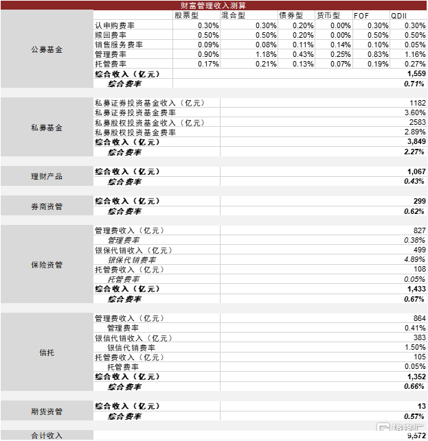 狭义口径财富管理收入约4517亿元。我们尝试对以上三项收入进行拆分,其中对于公募基金、私募基金、券商资管资管产品,考虑管理费分成影响,对于固定管理费及超额业绩提成部分计提50%为销售收入。测算结果显示,2020年销售收入/管理费收入/托管收入规模分别为4517/4395/660亿元。