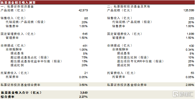 测算结果显示,2020年私募基金收入约3849亿元,对应2020年末17万亿元的基金规模,综合费率为2.27%,显著高于公募基金。