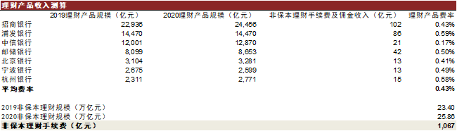 理财产品平均费率约0.43%,对应收入规模为1067亿元。根据主要上市银行非保本理财手续费费率,我们测算理财产品平均费率约为0.43%,结合2019-2020年平均非保本理财规模,理财产生收入约1067亿元。