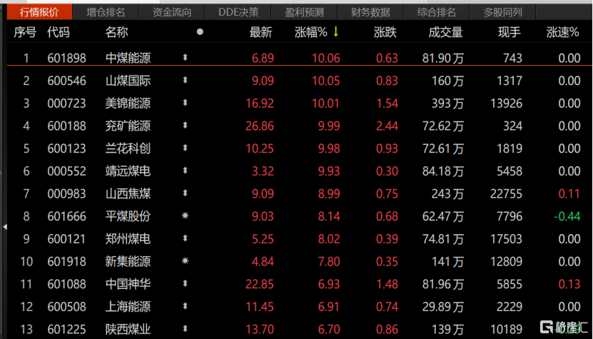 今日,AH股煤炭板块同时再现大涨行情。H股衮州煤业股份暴涨21.5%,中煤能源大涨10%,蒙古焦煤、中国神华等跟涨;A股山煤国际、美锦能源、衮矿能源涨停封板,山西焦煤、平煤股份等跟涨。