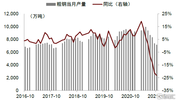 2021年10月,我国粗钢月度产量为7,158万吨,同比减少23.3%,环比减少2.9%。