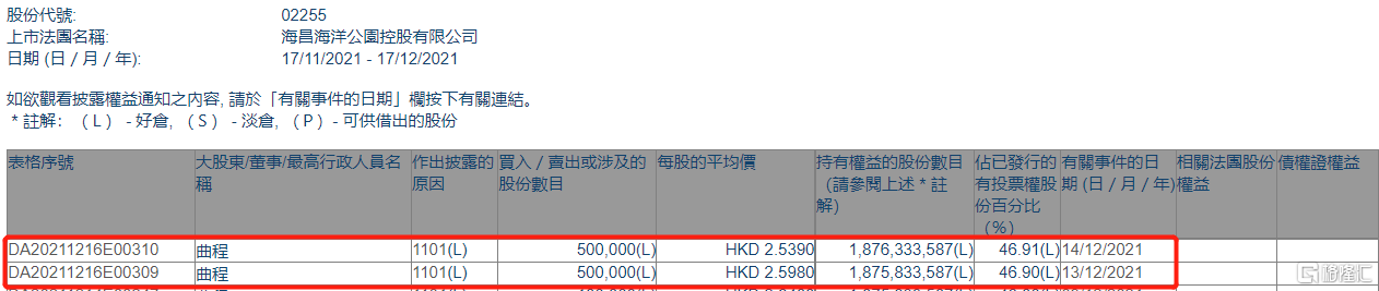 格隆汇APP获悉,根据联交所最新权益披露资料显示,2021年12月13日-12月14日,海昌海洋公园(02255.HK)获执行董事曲程在场内以每股均价2.539-2.598港元合计增持100万股,涉资约256.85万港元。