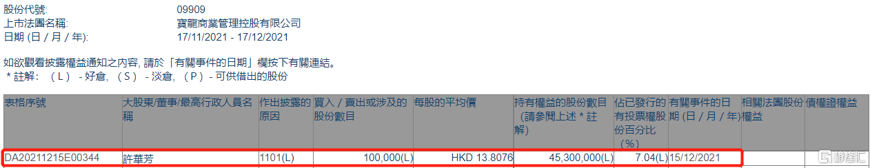 格隆汇APP获悉,根据联交所最新权益披露资料显示,2021年12月15日,宝龙商业(09909.HK)获执行董事兼主席许华芳在场内以每股均价13.8076港元增持10万股,涉资约138.076万港元。