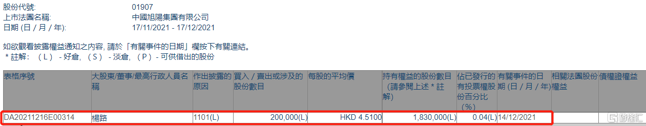 中国旭阳集团(01907.HK)获执行董事杨路增持20万股