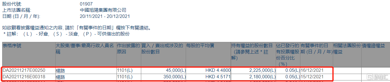 格隆汇APP获悉,根据联交所最新权益披露资料显示,2021年12月15日-12月16日,中国旭阳集团(01907.HK)获执行董事杨路在场内以每股均价4.48-4.5171港元合计增持39.5万股,涉资约177.7万港元。