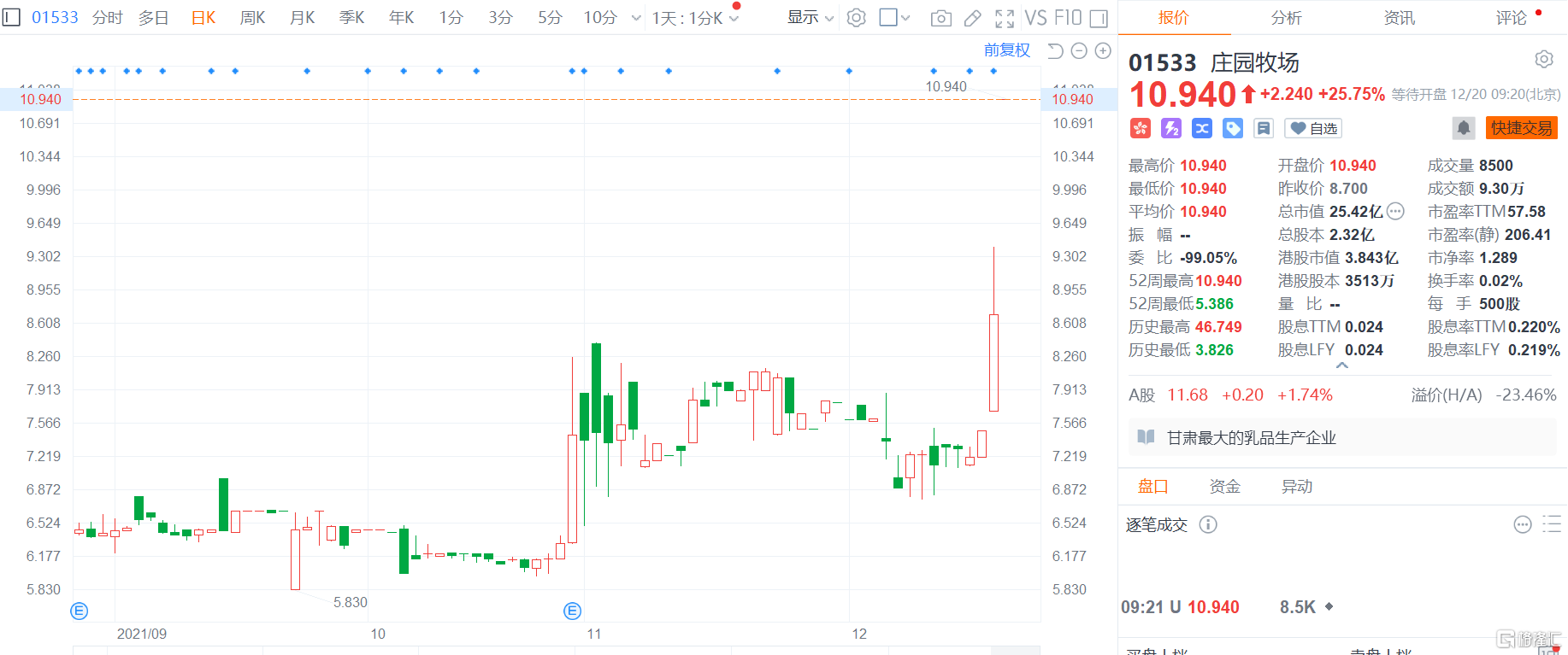 格隆汇12月20日丨庄园牧场(1533.HK)复牌高开近26%,报10.94港元创近四年新高,总市值25亿港元;庄园牧场(002910.SZ)竞价阶段目前涨1.74%。12月17日晚,庄园牧场宣布,公司董事会已同意开展H股回购及退市计划的筹划论证、前期准备工作。登陆H股之前,庄园牧场曾多次冲刺A股市场,过程可谓一波三折。2015年12月,登陆港股仅两个月后,庄园牧场就在公告中透露了A股上市意向。在此后的公告中,庄园牧场透露其A股上市意图为“公司运营发展需要”,并建议首次公开发行不多于4684万股。2017年9月,庄园牧场A股发行申请获证监会审核通过,成为国内首家同时在A股、H股发行股票的乳企。