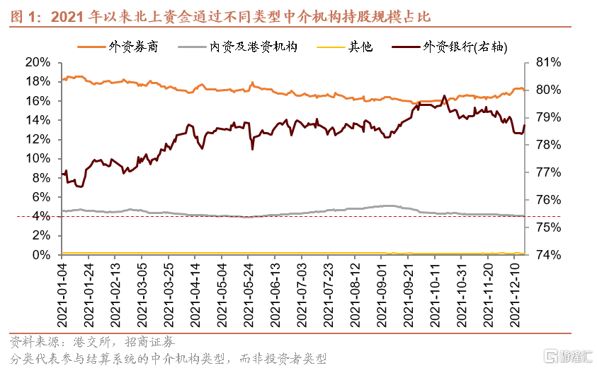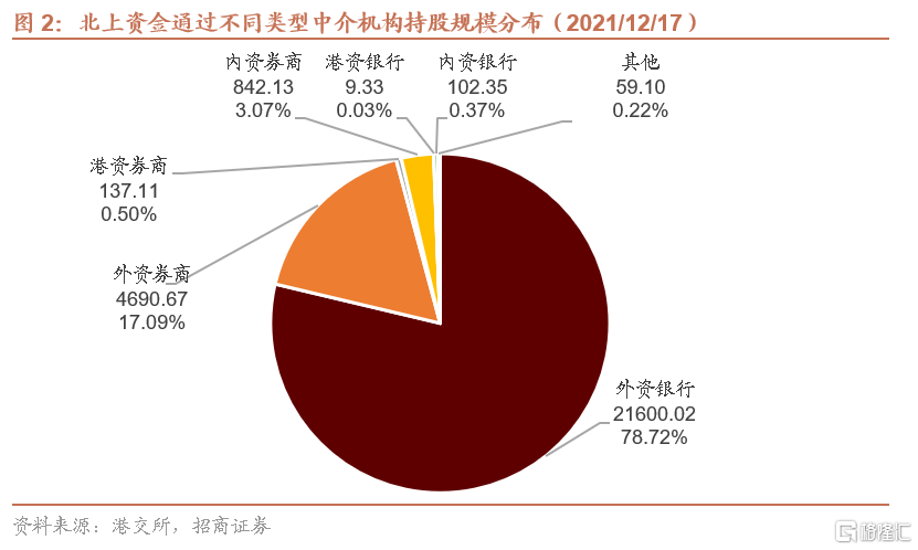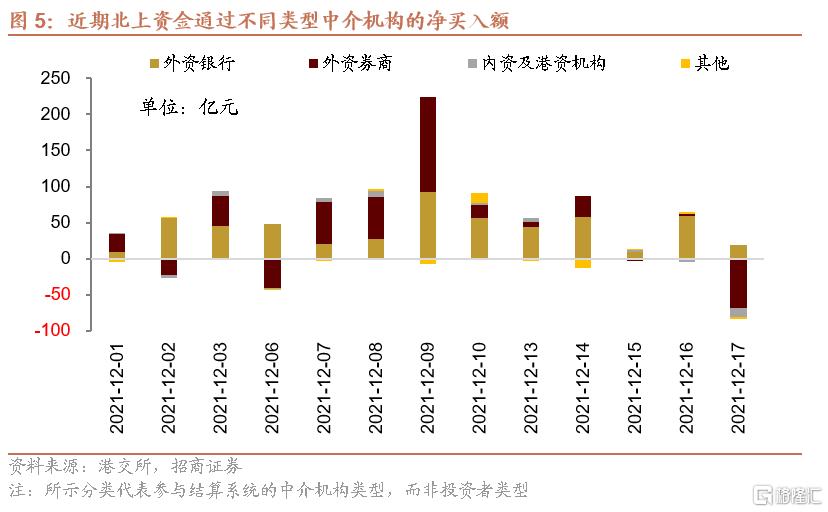 如果具体到不同类型中介机构,发现通过外资银行托管的投资者基本呈现净买入或者持平的状态,很少有明显流出,属于相对长期的资金,或以长期配置型外资为主。外资券商托管的投资者则波动较大,也是导致北上资金净买入额出现“大进大出”的主要来源,或以交易型外资为主。内资及港资机构托管的资金在每天的北上资金买卖金额中占比则比较低。在周五(12月17日)北上资金净流出65.6亿元中,除了交易型外资净流出较多外(-68.5亿元),通过内资及港资机构托管的北上资金也有净流出,净流出12.5亿元,相比之下,配置型外资仍有净流入。