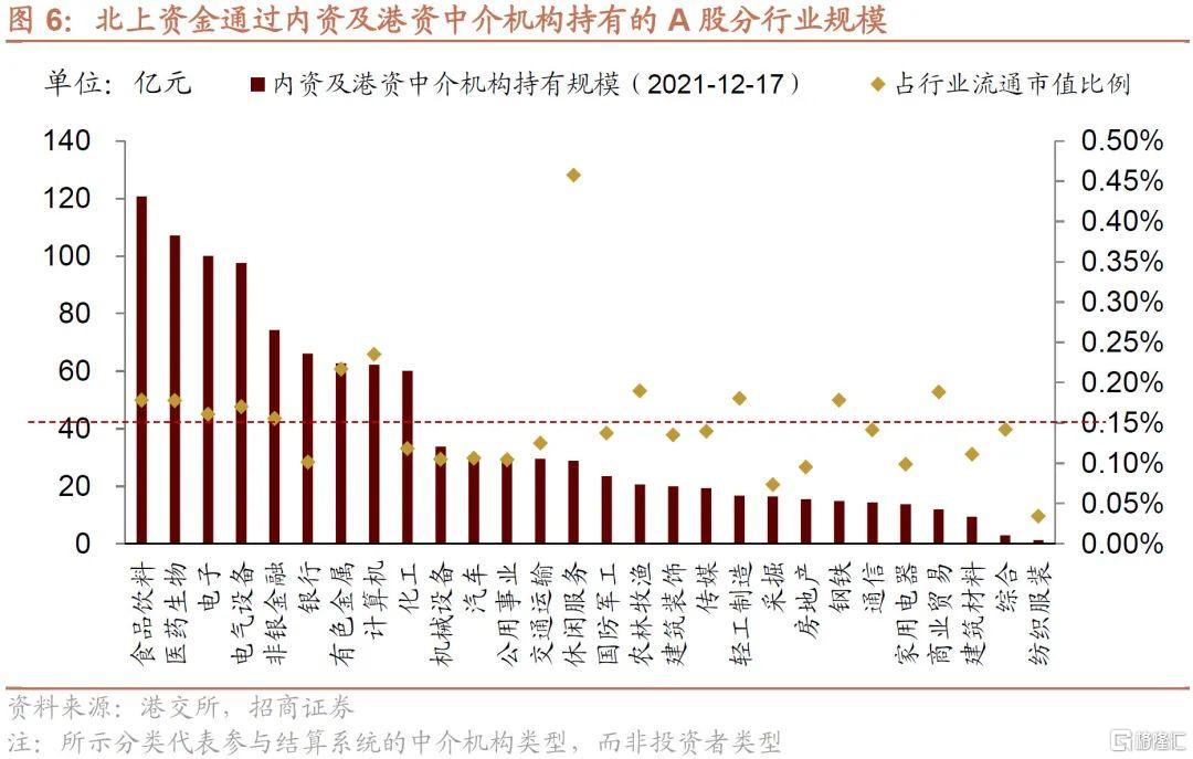 持股的行业分布方面,北上资金通过内资及港资中介机构持有的A股中,食品饮料、医药、电子、电气设备等行业的持股规模最高,不过除了休闲服务行业外,其他各行业持股占行业流通市值的比例基本在0.15%附近,占比都比较低,这部分资金对行业整体的影响比较小。