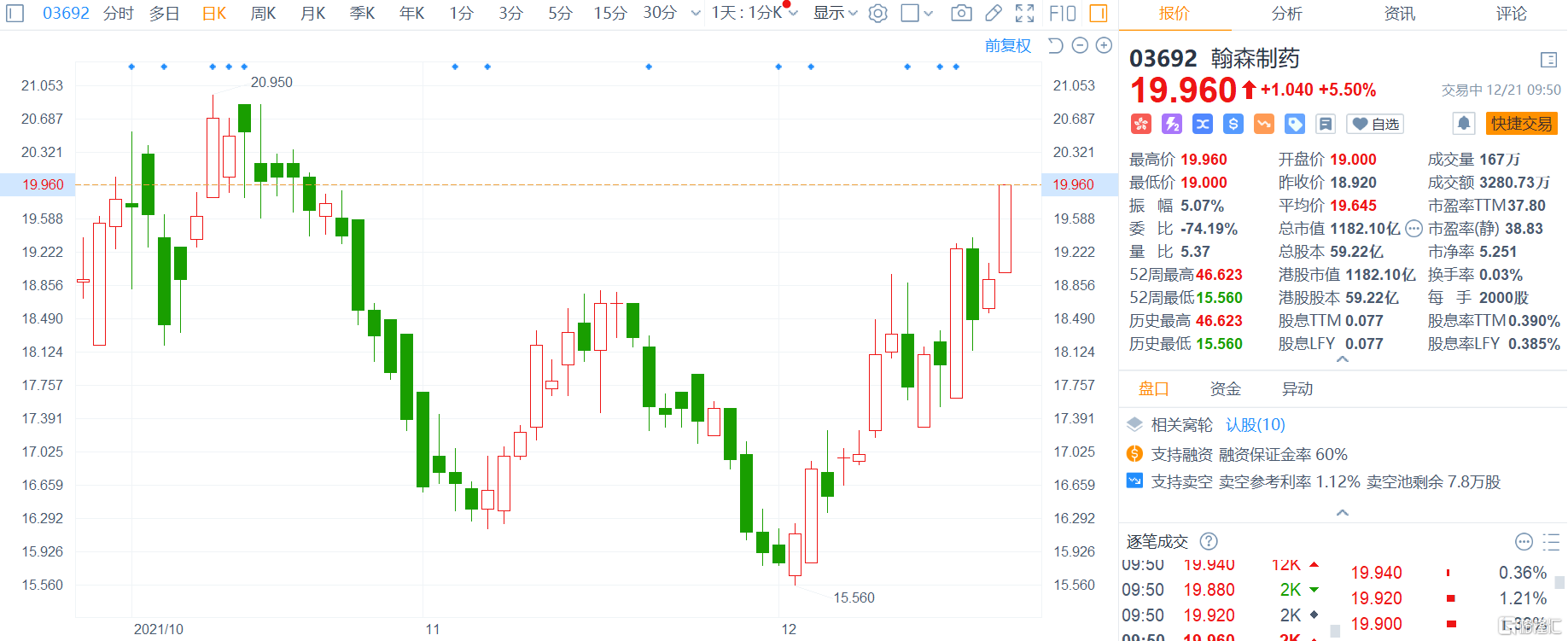 港股异动 | 翰森制药(3692.HK)涨5.5% 重磅药阿美乐一线NSCLC获批