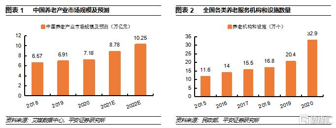 在国内老龄化程度加深、养老金水平提升的背景下,近年来国内养老产业保持稳定增长。据艾媒数据中心,2020年中国养老产业市场规模达7.2万亿元(YoY+3.9%),未来随着养老产业需求进一步提升,预计2022年中国养老产业市场规模可达10.3万亿元。此外,养老机构数量保持高增,截至2020年底,全国共有各类养老机构及设施32.9万个(YoY+61.3%),较2015年底增长21.3万个。