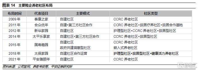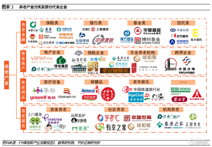 3)养老服务:满足老年人物质生活和精神生活的基本需求。从服务的内容来看,养老服务包括日常生活、经济理财、健康服务、精神文化、临终关怀和长期照护服务等多类。从不同养老模式的需求来看,居家养老模式服务主要包括上门服务和远程监控,社区养老模式提供日间照料和社区服务,机构养老模式则提供全方位服务。目前国内养老服务业仍处于早期发展阶段,市场较为混乱,养老服务企业仍未形成统一的服务标准。其中,险企主要通过自建及运营养老社区提供全方位的机构养老服务,部分险企也开始探索居家及社区养老服务的蓝海。