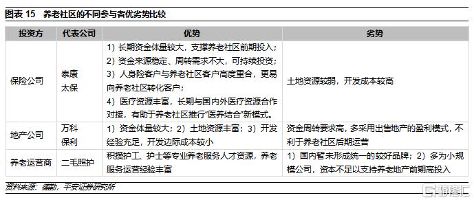机构养老服务以养老院、养老公寓、养老社区等专业老年人生活场所为载体,因此机构养老服务常与养老地产相结合,为老年人提供全方位服务。国内险企引入CCRC养老模式、开发护理型社区、发展连锁化旅居式养老,率先布局养老社区。尽管险企在土地资源、开发成本方面弱于地产公司,养老社区运营方面弱于专业养老服务机构,但在资金端、客户端、资源端均具备相对优势。