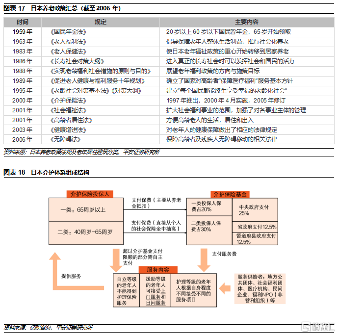 日本从20世纪70年代末开始步入老龄化社会,受地理环境、思想观念、政策倡导的影响,日本养老模式以居家养老为主,机构养老较少,形成居家养老服务为主的轻资产运营方式。政府针对老龄化而推出的相关法规十分完善丰富,从1959年颁布的《国民年金法》、1963年的《老人福利法》、1983年的《老人保健法》到2000年实施的《介护保险法》、2001年的《高龄者居住法》。通过一系列法律的规定,日本政府把原本分开的介护、医疗、福利结合在一起建立一个独立的介护体系,养老设施趋于住宅化,从“收容”场所向居住场所转变,发展非“自宅”的居家养老模式。