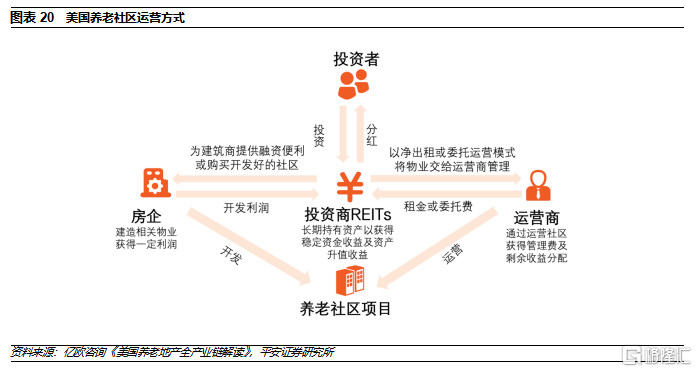 2)后期:养老社区的上市方式主要有两种,一种是养老社区直接上市的普通模式,另一种是较为典型的REITs(房地产信托投资)模式。基金公司将旗下养老社区资产打包,并将以资产包为主要标的资产销售给REITs,养老社区收益按比例分配给REITs的投资者。