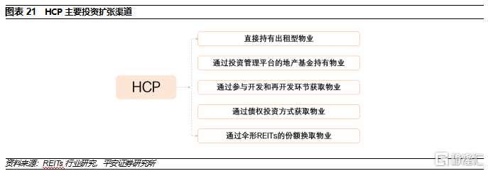 融资渠道稳定、信用评级高,HCP取得稳步发展。净出租模式下的营业收入稳定,使HCP获得较高的信用评级、公司融资成本较低。例如2011年公司发行总额24亿美元的无抵押票据融资,融资成本仅为4.83%。同时,HCP用REITs子公司的非管理份额换取其他公司物业资产(也即“伞型结构”),降低收购成本且避免母公司股份被过分稀释。