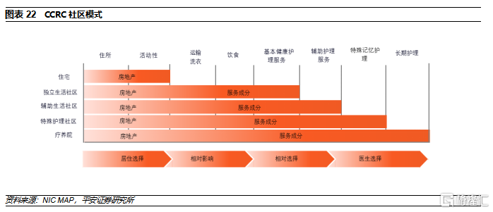 ⑤持续护理社区(Continuing Care Retirement Communities, CCRC):结合住宿设施和老年人保健服务,其目标是随着居民健康状况的变化而无需搬出退休社区,使居民能够在整个连续过程中获得适当水平的照料。一般的CCRC社区包含独立生活、辅助生活、特殊护理以及专业护理等功能,在美国,只要涵盖三种护理等级便可定义为CCRC社区。盈利模式主要是入门费及租金。