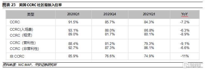总体来看,CCRC社区较受欢迎。根据NIC MAP的数据,2020Q2疫情爆发之前,CCRC的入住率连续22个季度浮动在91%左右,2021Q1美国CCRC社区平均入住率为84.3%(YoY-7.2pct),为2006年以来的最低。非CCRC社区平均入住率为74.9%(YoY-11pct),较CCRC社区低9.4pct,即使在疫情爆发的大背景下CCRC社区仍然更受欢迎。