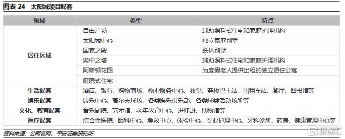 2)盈利模式:出售+出租。太阳城模式的本质是开发商主导的住宅开发,金融机构和企业为开发主体,政府提供周边基础设施建设。项目收益主要来源于一次性销售收益以及长期性收益包括公寓出租收益及配套设施的使用收益,其中一次性销售收益能够快速回款,但太阳城中心的长期性收益为项目收益的重要组成部分。同时,太阳城的目标客户为健康老人,一定程度上能够减少部分医疗护理等配套设施所需成本、降低开发成本,整体助理太阳城中心项目住房售价低、提高资金使用效率。