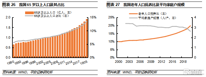老龄化程度持续加深,家庭户规模持续缩小,老年人口抚养比上升。第七次人口普查结果显示,我国60岁及以上人口数量已达2.6亿人,占比18.7%(其中65岁及以上人口为1.9亿人,占比13.5%),较2010年提升5.4pct,人口老龄化程度进一步加深。根据《智能养老:智能时代孕育的养老产业新业态》的预测,我国将在2024年至2026年进入深度老龄化社会。此外,受到我国近年来持续降低的出生率的影响,家庭户规模持续缩小,2020年共有家庭户4.9亿户,家庭户人口为12.9亿人,平均家庭户人口2.6人,较2010年减少0.5人。同时由于青壮年劳动力人口数量下滑,老年人口抚养比上升,家庭户规模和老年人口抚养比差距逐渐扩大,未来的家庭养老负担将会进一步加重。