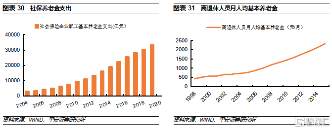 养老金水平提升,促进居民养老需求释放。2021年人社部上调养老金标准4.5%,为连续第17次上调。从社保支出的角度看,我国社保企业职工基本养老金支出自2003年披露以来持续上涨,2019年共支出3.3万亿元,较2018年增加9.6%。