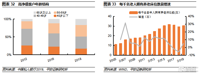 中高端养老市场崛起。根据中国建设银行与波士顿咨询公司开展的私人银行客户调查显示,超过50岁的高净值客户占比过半。同时据《中国养老产业发展白皮书》预测,至2030年中国养老产业规模有望达到13万亿元,且我国首批中产阶级(指改革开放后的首批工薪阶层)即将步入退休年龄,该群体目前主要集中在50岁至65岁,是我国第二次婴儿潮主要群体,充分享受过去40年我国经济高速发展红利,具有积蓄较多、社会负担较小的特点,有较高的消费能力。随着这部分群体步入老龄化,养老产业的潜在市场十分可观。