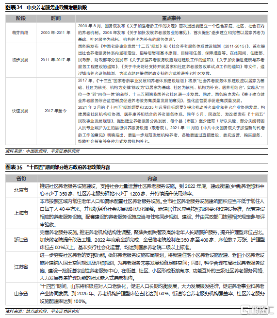 根据联合国标准,我国自1999年正式进入人口老龄化社会,中央随之开始系统发布养老服务业相关的政策,自2000年至今中央政策发展可分为萌芽、初步发展、快速发展三个阶段,分别以《中国老龄事业发展“十二五”规划》、《“十三五”国家老龄事业发展和养老体系建设规划》为各阶段分割点。随后“十四五”规划进一步强调养老问题,各地区纷纷响应并出台地方养老政策。