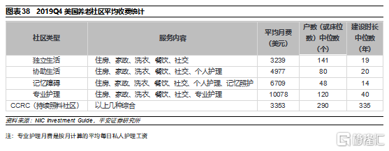 从收费标准来看,服务内容越专业、服务类型越丰富,服务收费越高,专业护理对服务设施、服务内容的专业性要求最高,平均月费最高,2019Q4专业护理平均月费达1.0万美元。