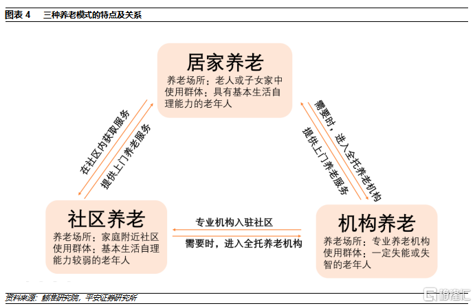 2011年民政部出台《社会养老服务体系建设规划(2011-2015年)》,提出我国的社会养老服务体系主要由居家养老、社区养老和机构养老等三个有机部分组成,具体来看: