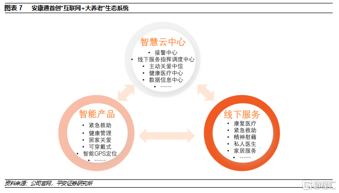 商业模式:从标准化服务到链式科技养老新模式升级,B2G赚取技术服务费。安康通成立以来,不断升级服务、扩张覆盖区域。现阶段安康通主要商业模式仍为B2G模式,主要承接政府居家养老业务,以硬件产品、软件系统和呼叫中心作为基础,在与政府合作的养老服务覆盖区域向老年用户销售紧急援助服务、家政服务、主动关爱、医疗健康、生活信息等综合服务,并收取相关服务费。具体来看: