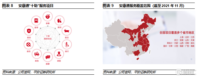 3)“链式科技养老”阶段(2020年以来):安康通打造“链式科技养老”解决方案,以科技为手段,实现线上、线下服务的融合,同时通过数字平台整合居家、社区、机构养老资源后进行再分配,实现不同场景下养老服务的联动。此外,安康通迅速扩张覆盖区域,2020年全国新增10个业务覆盖区域,市场区域新增10个区县级以上地区,新增养老服务平台25个,截至2021年11月,安康通共计覆盖18个省市地区。