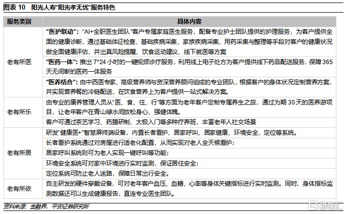 居家养老服务轻资产运营,依托于“大健康”产业基础,部分险企正积极探索。目前部分险企已开始布局居家养老服务领域,1)2020年9月,爱心人寿发布“爱+居家养老产品计划”,计划以“年保障+医养服务”的组合方式提供居家养老解决方案。2)2021年8月,平安宣布未来将采取“机构养老+居家养老”一体化模式,在“保险+高端养老”、“保险+健康管理”外试点“保险+居家养老”。3)2021年11月,阳光人寿推出行业首创“阳光孝无忧”居家养老服务体系,贴合居家养老需求、重点聚焦居家医疗,实现家庭医生视频问诊、内置购药平台等医疗护理功能;此外,“阳光孝无忧”还提供智能终端、爱心送餐、适老化改造评估安排、康养旅游等服务。目前险企仍停留在居家养老服务的尝试阶段,从规划的服务内容来看,医养优势明显,但与安康通相比,上门家务等日常生活服务、陪伴沟通等精神文化服务仍待完善;另一方面,居家养老有待向智能化、平台化转型,通过智能产品实时监控老年人健康状况、安全情况,并通过互联网平台实现规模效应。