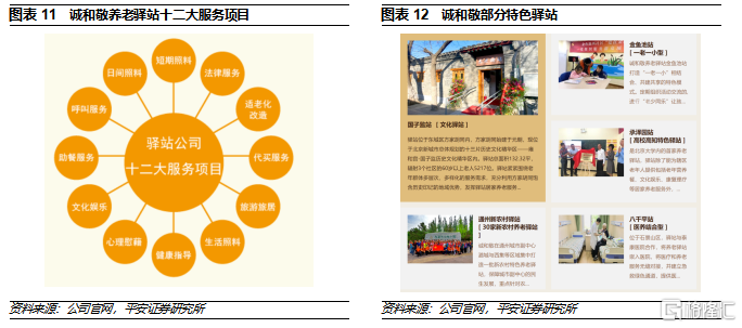 诚和敬提供标准化服务项目,打造连锁养老驿站。相比于以前由居委会等社区和政府机构主导的托老所,养老驿站不仅提供日间照料、短期照料服务,还提供上门协助、文化活动等多样化服务。诚和敬养老驿站经ISO标准认证,提供助餐、文娱、代买、呼叫、照料等十二大标准化的服务项目,同时根据不同社区特点,提供“15分钟救助圈”、医养结合、高校高知等特色服务。目前诚和敬已在北京布局大中型养老机构“诚和敬长者公馆”两座,社区型养老驿站“诚和敬养老驿站”近百家,辐射北京47个街乡镇和300余社区,覆盖15万老人,实现主城区和城市副中心的全覆盖。