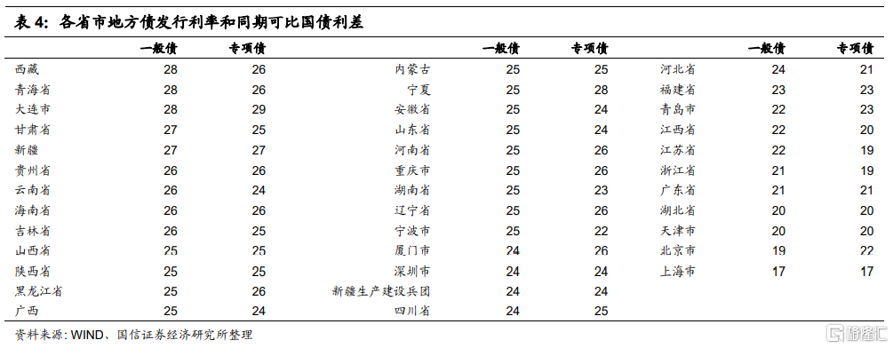 然后把2021年各省市地方政府债发行利率和同期可比国债利率相比,各地方利差见表4。从统计结果来看,各省市地方债和可比国债利差基本稳定在25BP左右,不管是一般地方债还是专项地方债。