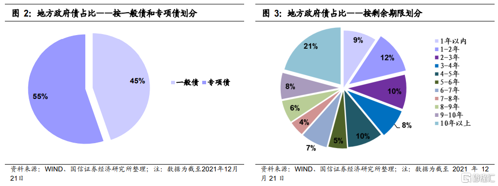 按照用途来看,截至2021年底,一般债占比45%,专项债占比55%,专项债存量规模开始大于一般债。按照剩余期限来分,剩余期限10年以上的余额占比21%,另外1-2年地方政府债占比12%,占比次高。