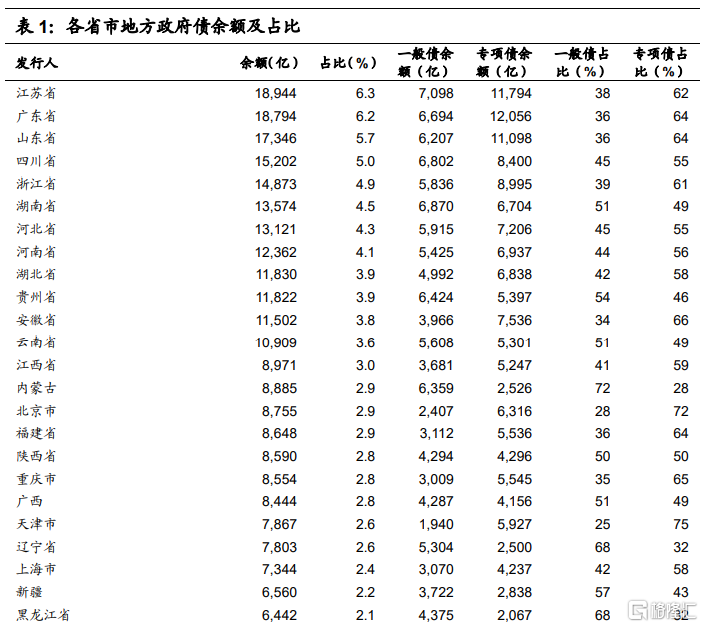 江苏省地方债全国占比最高,广东省其次