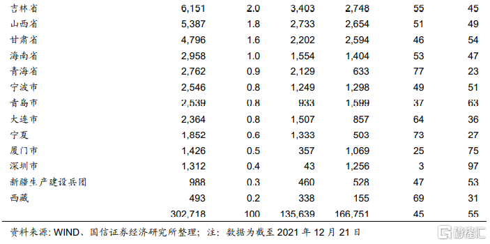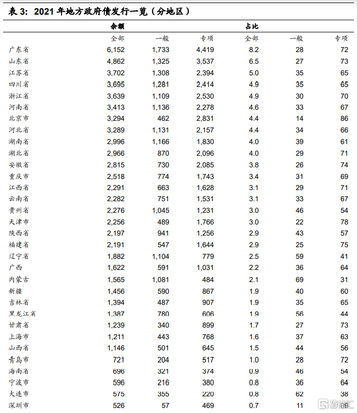按省市来看,2021年地方政府债发行前三分别是广东省、山东省和江苏省,发行额占比分别为8.2%、6.5%和5.0%,2021年广东省专项债发行明显加快,江苏省地方债发行相对放缓。