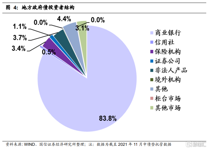截至2021年底,地方政府债的主要投资者为商业银行,它们持有84%的地方政府债,其次是非法人产品,持有3.7%,然后是保险机构,持有3.4%。