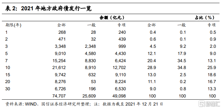 发行方面,2021年共发行地方政府债7.5万亿,其中一般债34%,专项债66%。2021年专项债发行占比继续较高。期限来看,2021年发行的10年期地方政府债占比最高,为28.9%。