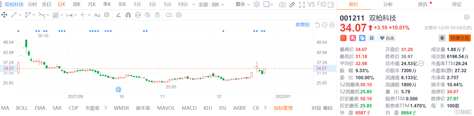 格隆汇12月28日丨双枪科技(001211.SZ)高开高走涨停,报34.07元,总市值24.5亿,现有封单4万余手。公司昨日公告称,通过全资子公司投资建设年产3000万件餐厨配件生产基地项目,该项目总投资估算为人民币2亿元。