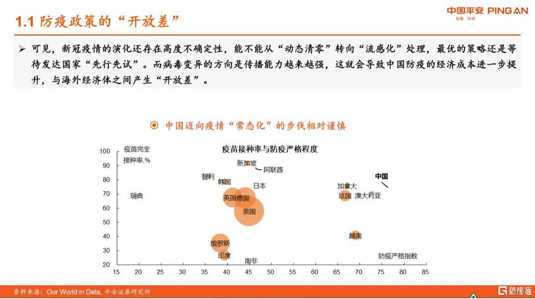 为什么说防疫政策上有个开放差,我这里面我就挑一些最重点的来讲,我们可以看一下防疫的严格指数和疫苗的接种率的情况,其实中国的一个疫苗接种率其实非常高,防疫的严格指数也是非常高。在这次奥密克戎病毒变异之前的话,其实很多发达经济体已经开始在开放边界了,但中国其实还是一个比较严格的动态清零的策略。