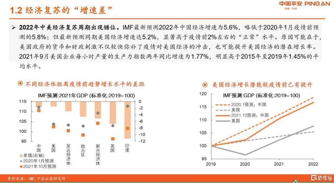第二个方面的差异就是经济复苏上的一个增速差。我们看一看IMF最新的一个预测,明年的中国经济的增速是5.6%,其实比去年2020年1月份疫情前预测的5.8%要略低一点。但最新的预测同期美国的经济增速是5.2%,显著高于疫情前2%左右的正常的水平。就是中国经济增速比美国的经济增速还是高了0.4个百分点。但是我们这里面有一个,就是说其实美国现在的经济增速已经超出了疫情之前它的一个趋势增长的水平,而中国现在的增速显然是不够疫情之间趋势增长的一个水平。