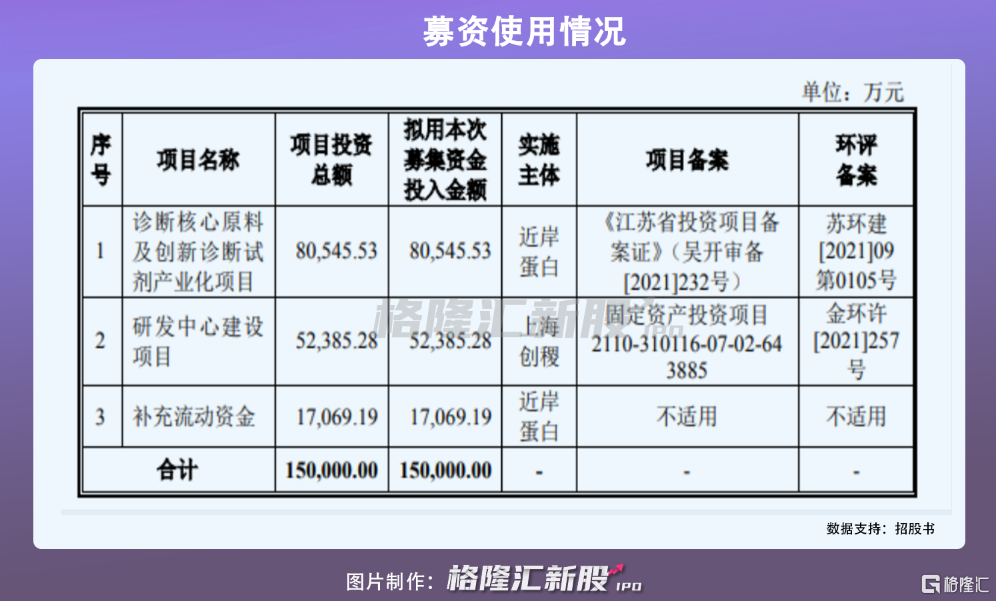 本次IPO拟募资15亿元,主要用于诊断核心原料及创新诊断试剂产业化项目、研发中心建设项目以及补充流动资金。