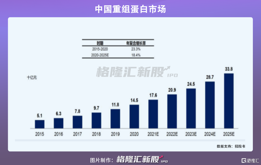 随着中国生物制药行业的蓬勃发展以及新冠疫情的影响,重组蛋白市场发展势头强劲。根据Frost & Sullivan数据,中国重组蛋白市场规模从2015年的51亿元增至2020年的145.4亿元,期间年复合增长率为23.3%,预计2025年市场规模将达到337.7亿元,2020年至2025年间年复合增长率接近18.4%。