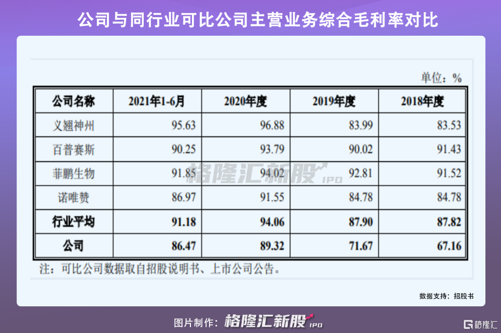 具体来看,报告期内,近岸蛋白实现主营业务收入 分别为2598.59万元、3557.43万元、1.80亿元、1.31亿元;公司主营业务综合毛利率分别为 67.16%、71.67%、89.32%、86.47%,增势较明显,不过还是低于同业的平均值。