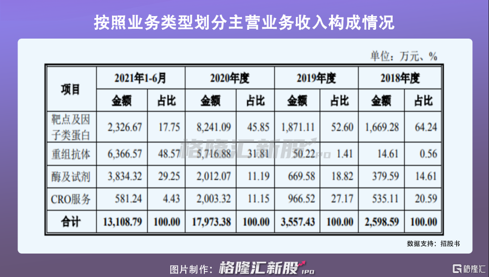按产品划分,报告期内,公司重组蛋白产品业务的占比分别为 79.41%、72.83%、88.85%、95.57%,系主营业务的主要构成部分。而CRO 服务收入占比较小。