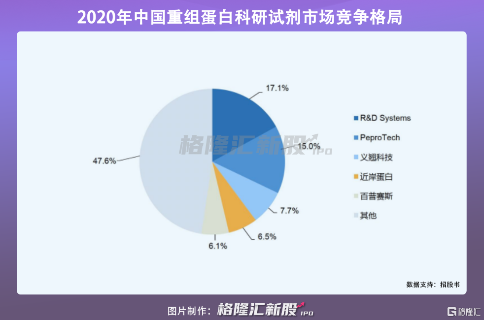 根据Frost & Sullivan数据,2020年中国重组蛋白科研试剂市场的第一和第二名分别为R&D Systems和PeproTech,近岸蛋白占据了国内总体市场6.5%的份额,在中国重组蛋白科研试剂市场位列第四,在国内厂商中位列第二。